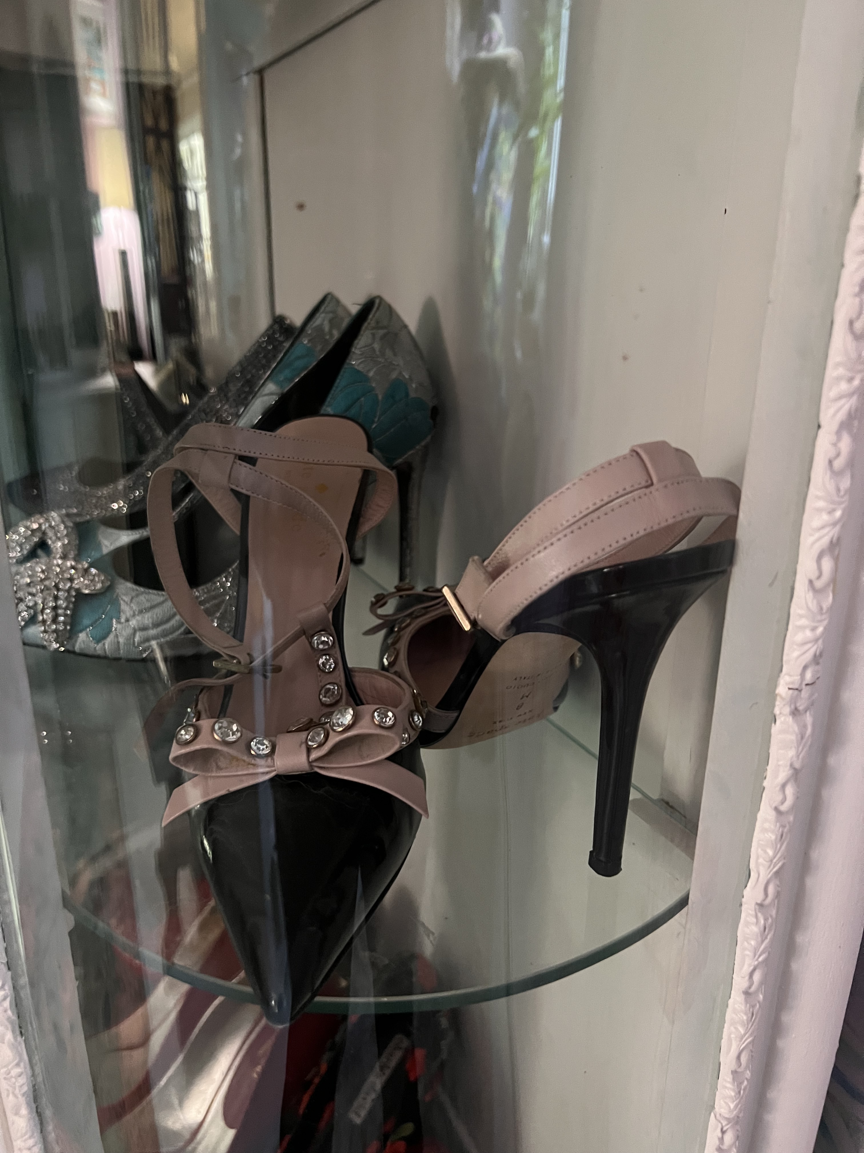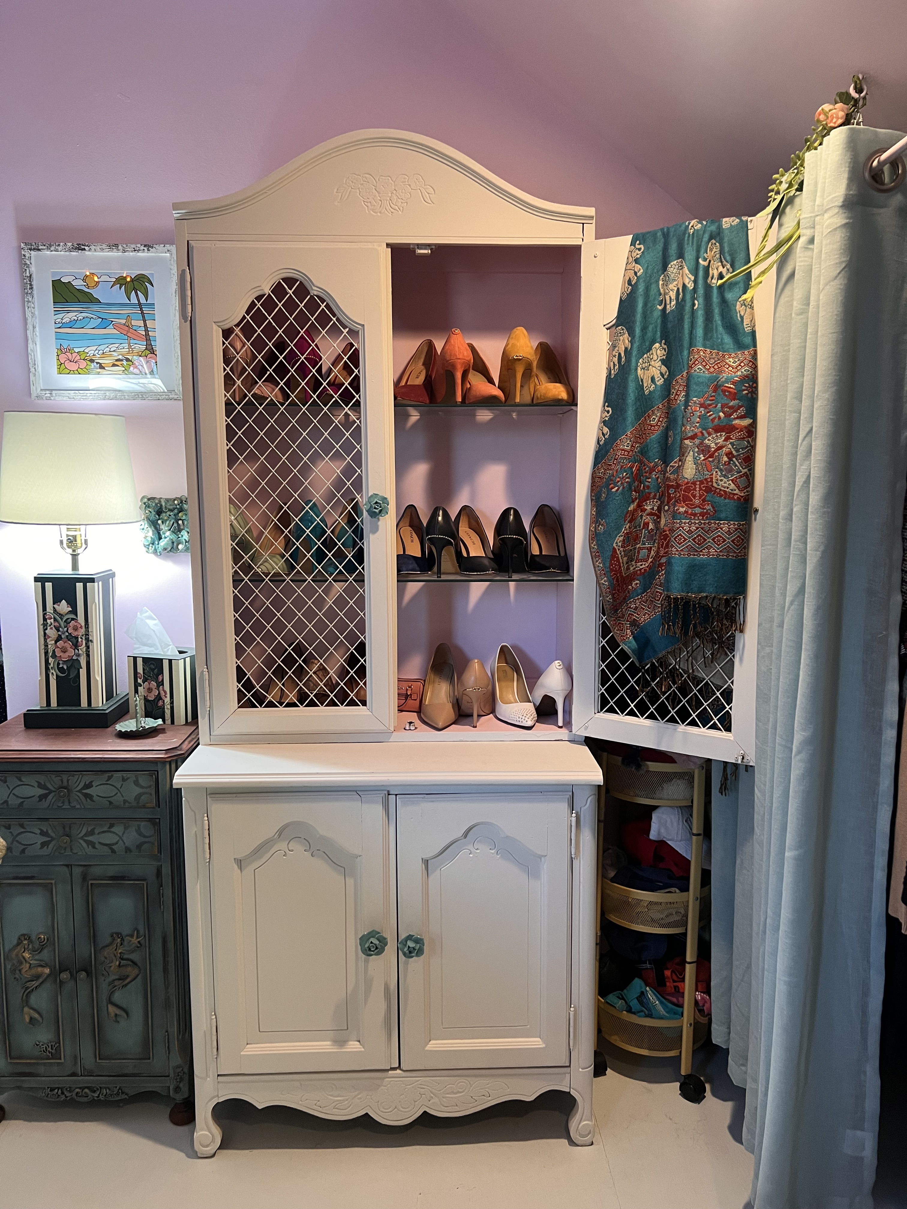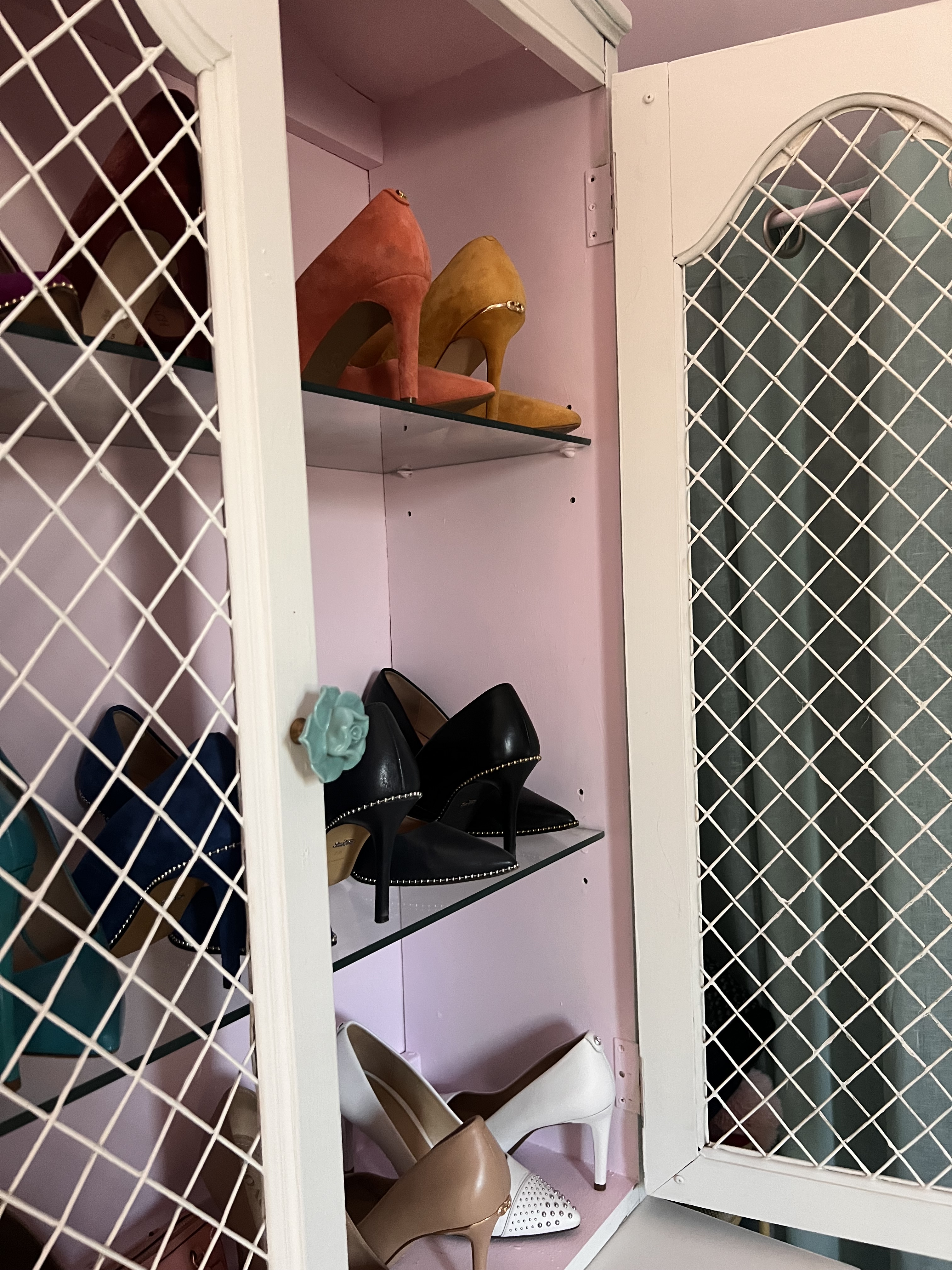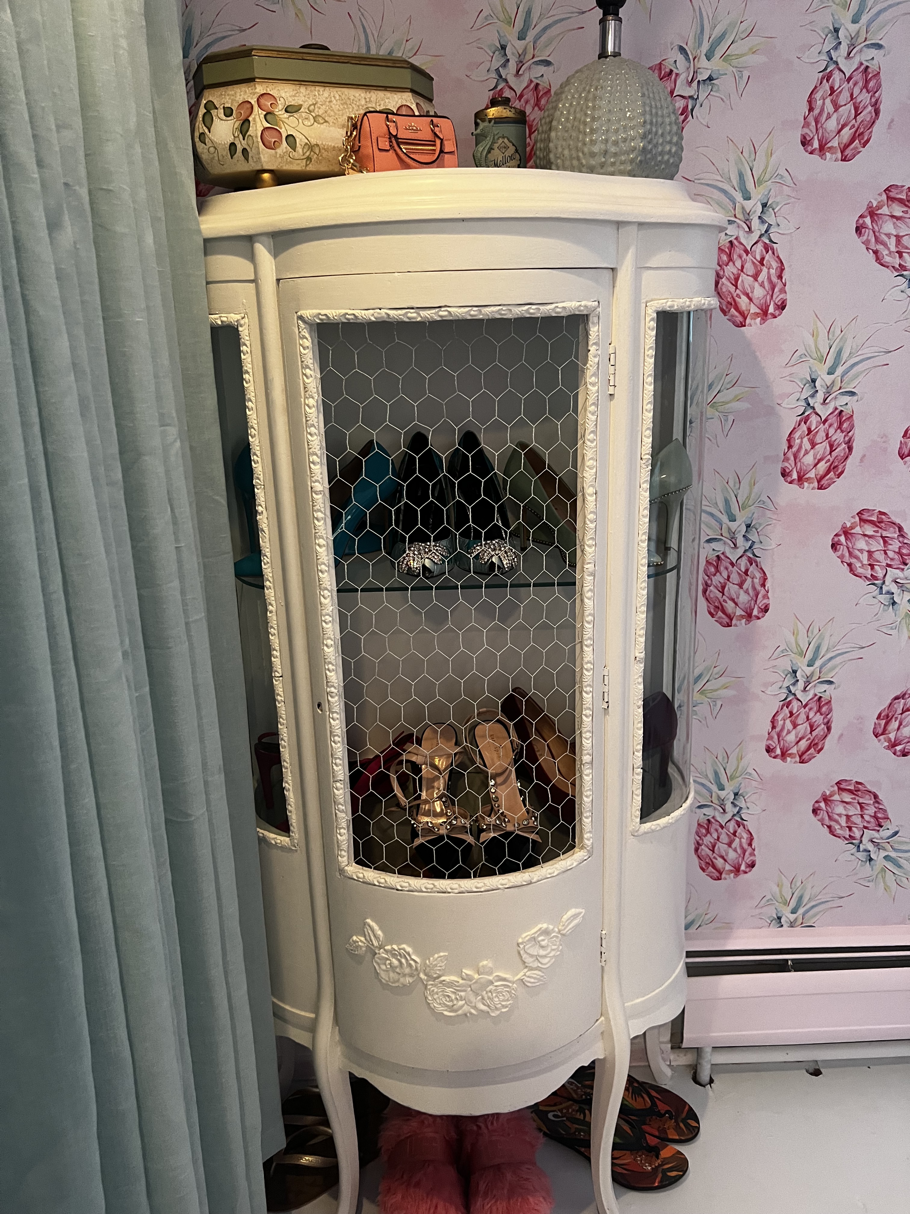 When designing my new closet (full post coming soon) I had to find a special way to display my most special pairs of shoes. I had a dream that my closet would be a personal boutique that I could shop in every morning. I could not afford a custom closet and personally that is not exactly my style. I wanted to mix in some antique and vintage furniture in my new closet. I decided to find old curio cabinets versus a shoe rack to display my shoes. I started by finding two curio cabinets on Facebook Marketplace. One of them needed more work than I realized, but I still loved it. Original posts below. I purchased these for around 100-200 dollars each.