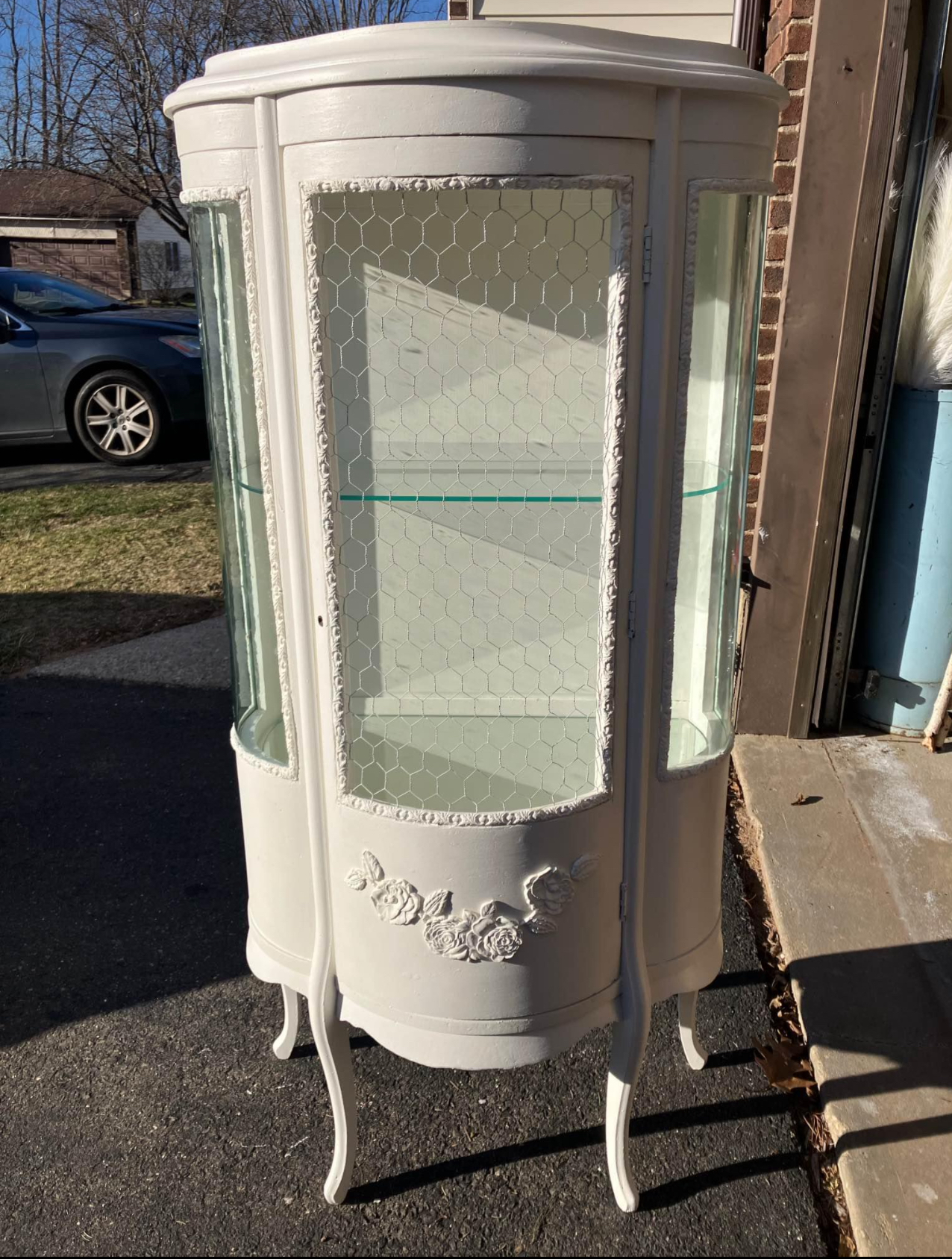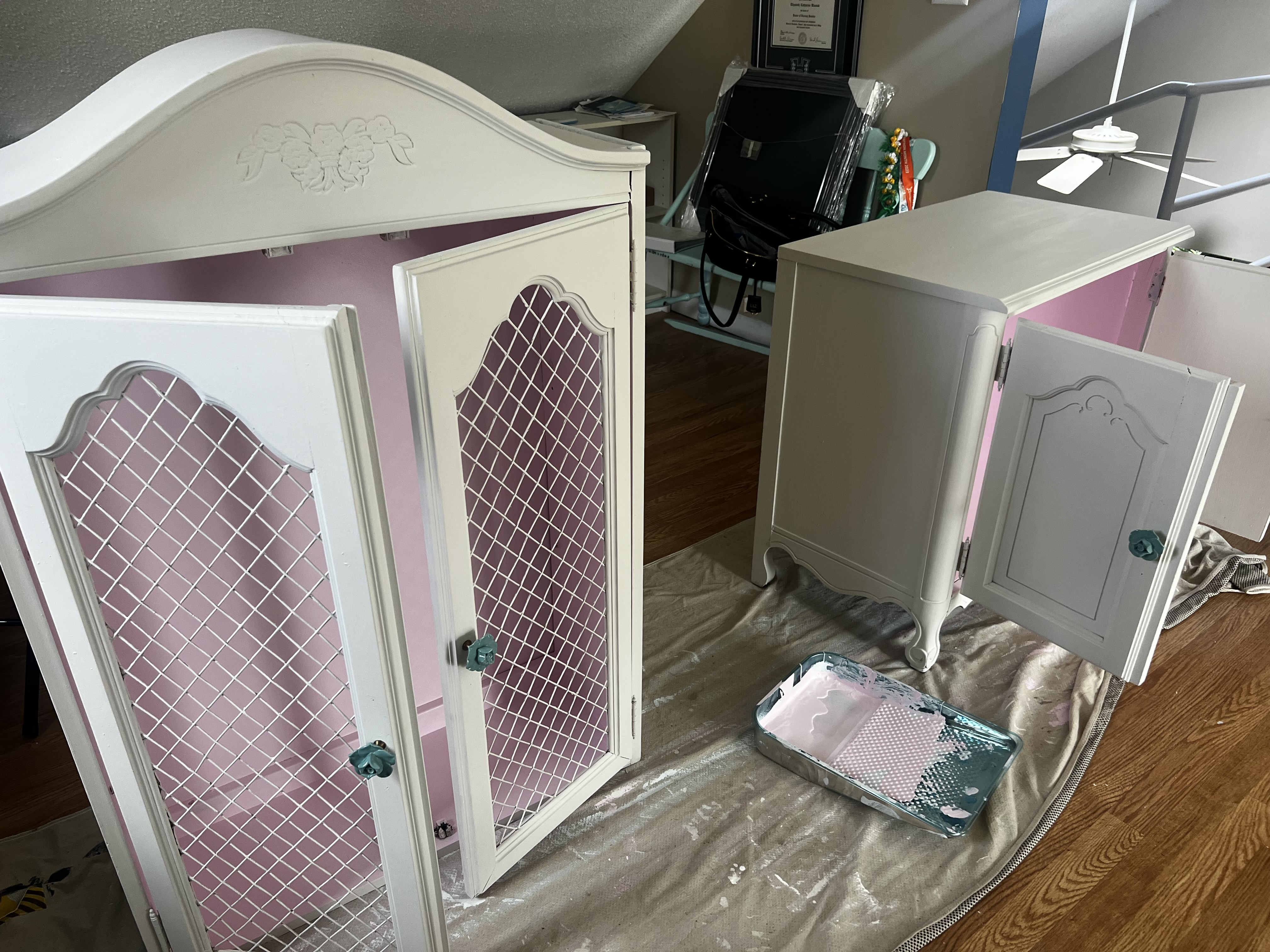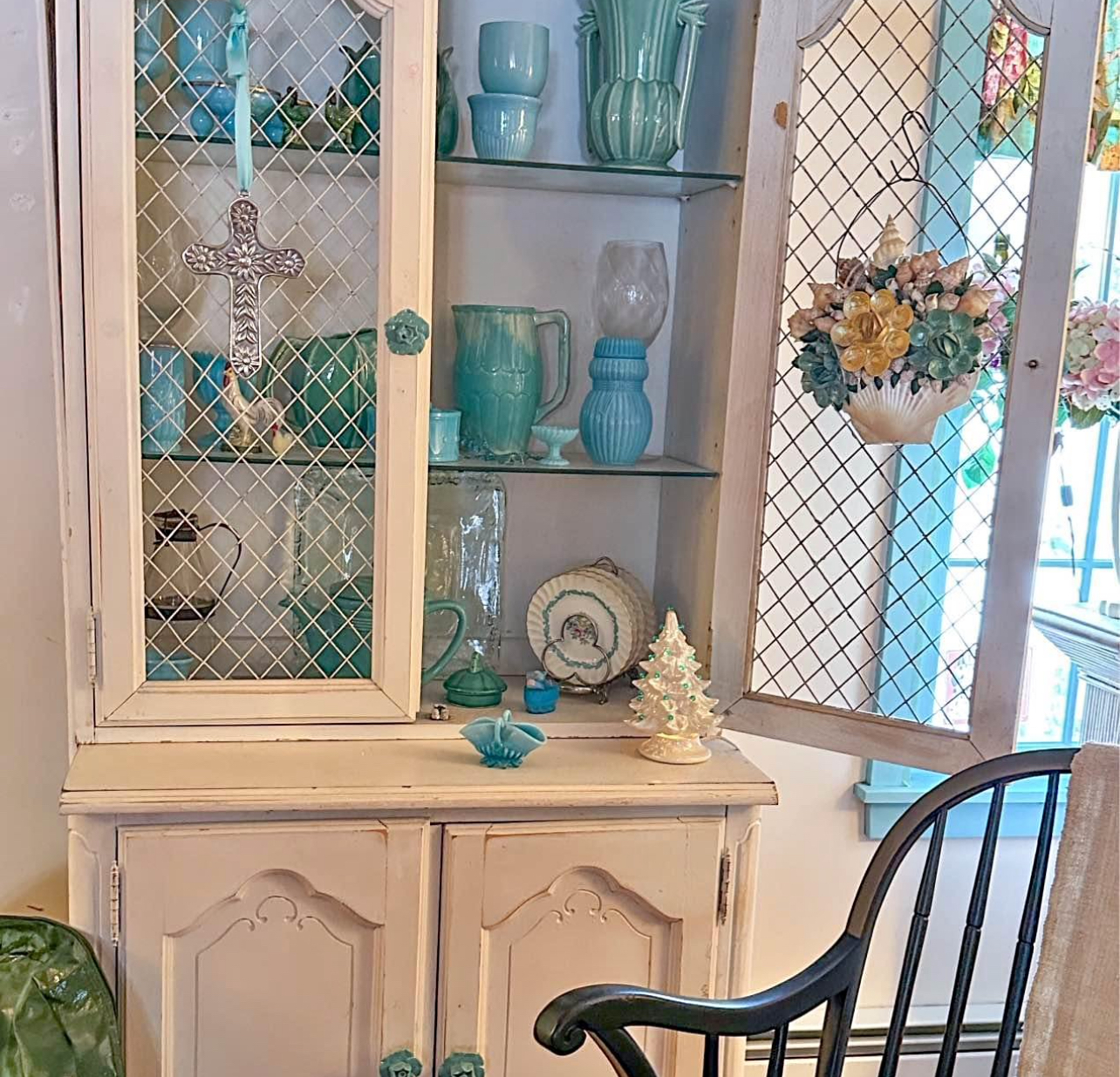 After painting the hutch to the right with leftover flat pink ceiling paint (Tip: I love painting ceilings with color!), the interior of the old cabinet came to life. There was much staining to this piece as it had been in storage for probably some time, so it needed a good cleaning and fresh paint inside and out. Tip: I like to use leftover flat paint as I would chalk paint on furniture. It covers well and if you are not going for a high gloss finish it will work perfect. The curio to the left needed some fixing to the glass shelves. Thankfully the sides of the rounded glass were intact and shown below. Both pieces had chicken wire versus glass in some areas, which tied them together and brought the perfect charm. Tip: If you find pieces with missing glass, chicken wire can easily add charm for a low cost. I do recommend adding a coat of paint to the chicken wire but be very careful to go light on your paint and watch for drips.